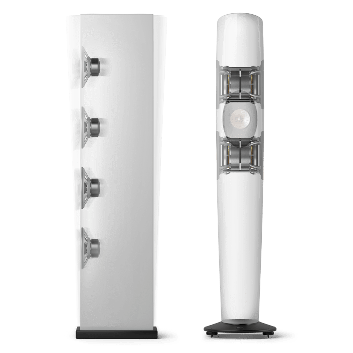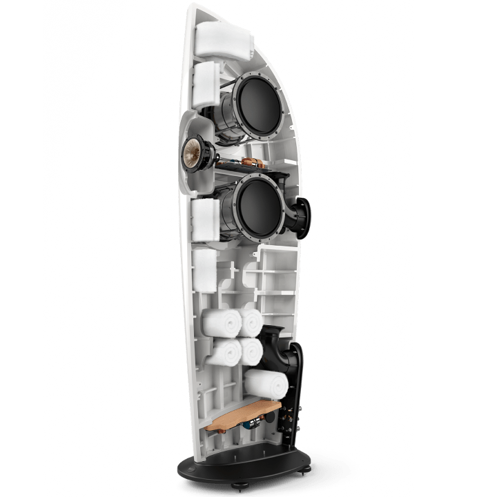 On Blade, each pair of low frequency drivers is located in its own chamber. This approach reduces the potential for interference between the drive units, while also reducing the need for damping, which can impair bass quality.